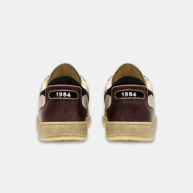 Estamos en 1984, año en el que un par de zapatillas escriben la historia del baloncesto: son las MI Basket. En esta ocasión el emblemático modelo se presenta en versión MI Basket Low Metallic Dirty, de piel plena flor laminada premium, con aplicaciones de ante, tratamiento de lavado a la piedra y encerado.
