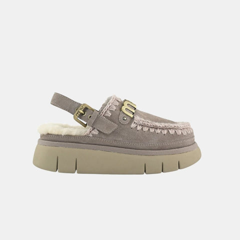 Como novedad para la temporada Otoño-Invierno, los zuecos mou bounce con correa trasera con strap están elaborados artesanalmente con genuino ante y las características costuras de lana de la marca cosidas a mano, plantilla suave de piel de oveja, logo metálico y suela de EVA flexible y ligera.